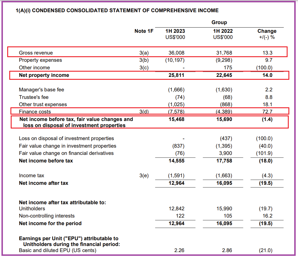 As aforesaid mentioned, the net property income has increased by 14%. However, the finance cost has went up by a whopping 72.7% which thus dragged down the overall net income before tax and fair value changes by -1.4%.